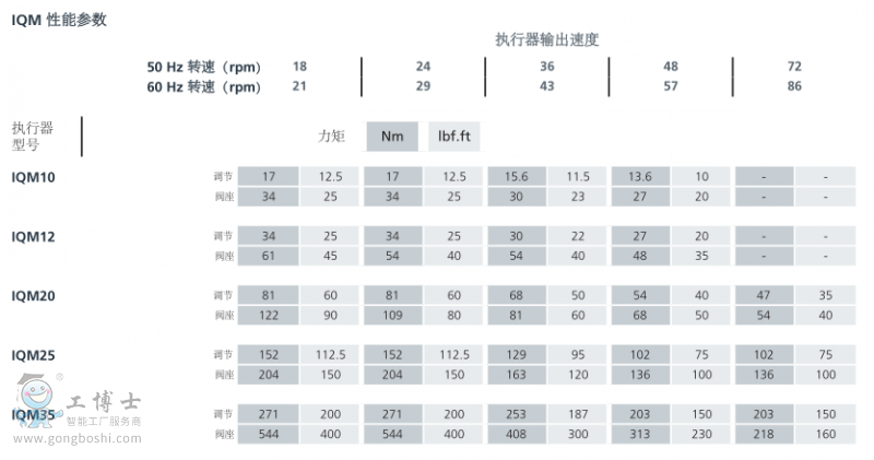 的場合我們可以把IQM同MOW型齒輪箱裝備在一起提供給用戶。要求扭矩低于1080Nm的時候, 可以考慮使用AQM執行器一般來講IQM執行器的規格與IQ系列相同,但是IQM執行器是用固態換向啟動器代替了IQ的機電時接觸器。IQM的馬達采用適當規格的帶四級繞組和低扭矩的馬達,其齒輪傳動機省掉了錘擊效應。