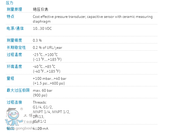 Cerabar PMC21是緊湊型壓力變送器。電容式結(jié)構(gòu)的非充油型陶瓷膜片傳感器用于絕壓或表壓測量,量程從100 mbar到40 bar。變送器能夠在過程行業(yè)中的惡劣工況下測量,*高防護(hù)等級(jí)可達(dá)IP68,帶強(qiáng)耐磨損性的Ceraphire膜片和高品質(zhì)316L材質(zhì)的外殼。具有多項(xiàng)認(rèn)證(例如:防爆認(rèn)證或船級(jí)認(rèn)證),滿足絕大多數(shù)測量場合的使用要求。