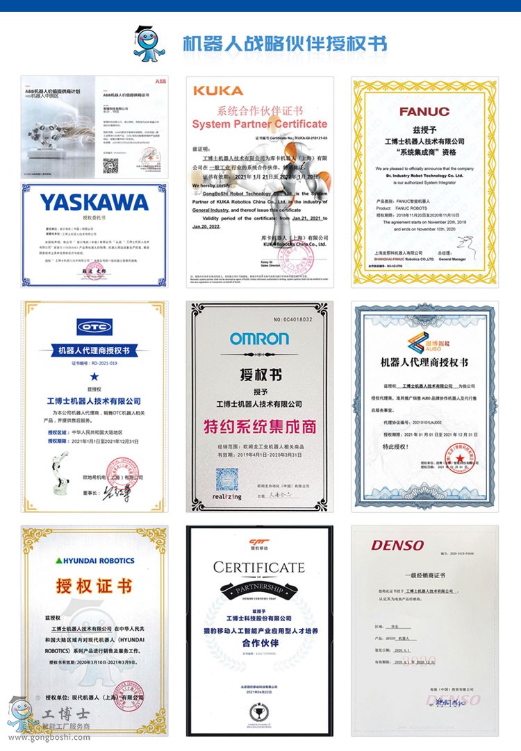 工博士機(jī)器人技術(shù)有限公司致力于為您提供ABB、庫卡KUKA、安川YASKAWA、發(fā)那科FANUC、歐地希OTC、川崎Kawasaki、遨博AUBO、現(xiàn)代HYUNDAI、電裝DENSO、歐姆龍OMRON、愛普生EPSON等進(jìn)口***機(jī)器人銷售、項(xiàng)目集成、機(jī)器人代理、機(jī)器人配件、機(jī)器人售后維保、機(jī)器人培訓(xùn)一站式服務(wù)等優(yōu)質(zhì)服務(wù)。我們擁有***的機(jī)器人產(chǎn)品及***的技術(shù)團(tuán)隊(duì)為您的成功保駕護(hù)航!!!