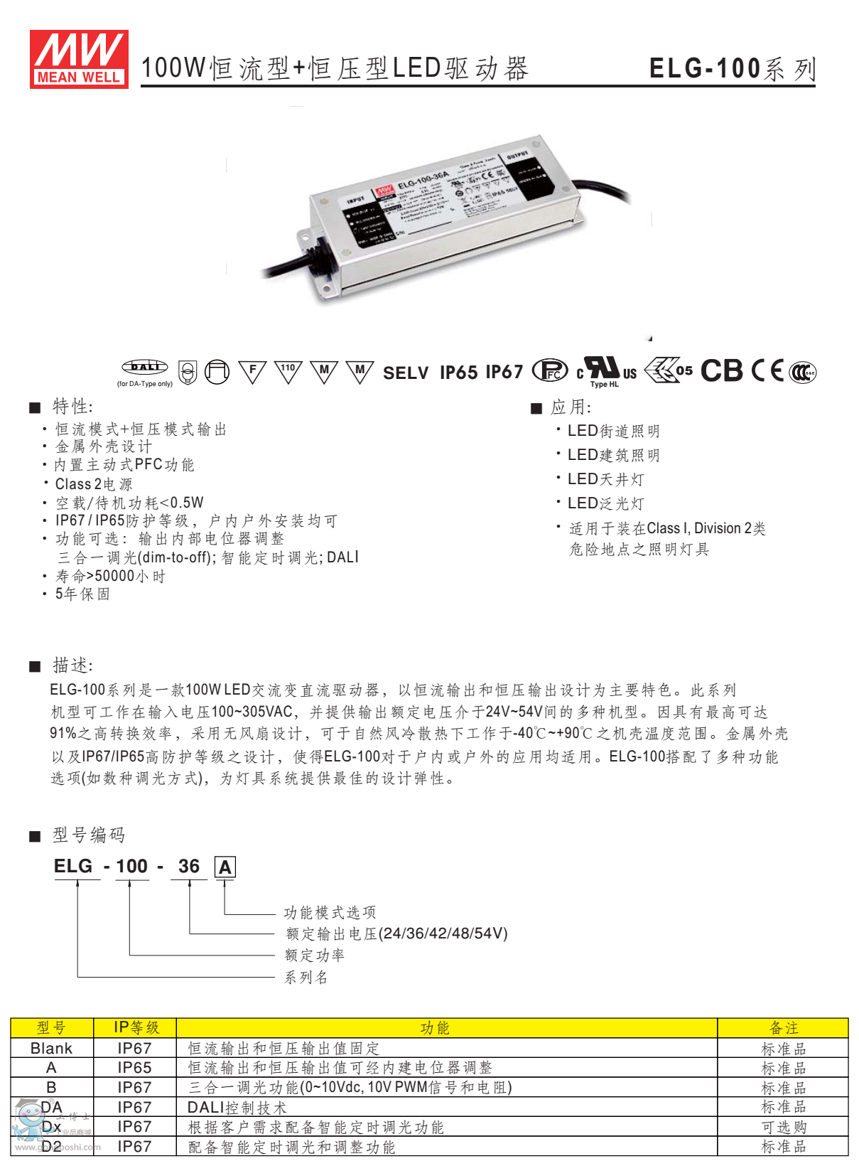 臺灣明緯LED防水電源ELG-100-48A 100W48V2A