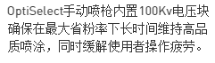 全新設計的21世紀可靠靈活的靜電粉末手動噴槍是按人機工程學原理專門從新設計的,能夠使操作者更加舒適地工作,集成的100Kv高壓發生器能夠確保高上粉率和穩定的噴涂質量。Optiselec 手動靜電粉末噴槍的遠程遙控功能可使操作者通過調節在噴槍后面的控制板上的按鈕遠程調節出粉量和噴涂程序號!OptiSelect手動靜電粉末噴槍是真正實現無疲勞噴涂的*佳選擇。