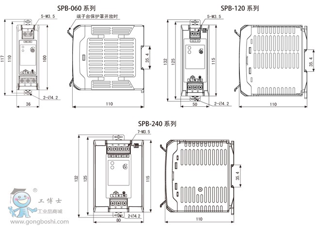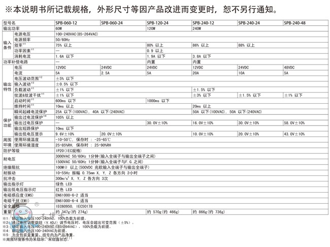 SPB系列采用DIN導軌式和固定螺釘安裝方式,可節省安裝空間,使超薄型開關電源成為可能。DC輸入設計,用于抗電磁干擾及減少紋波,使電源更加穩定,符合電子認證及安全標準。端子保護蓋設計,同時內置過流保護,輸出短路保護,過熱和過電壓保護電路(SPB-120),低電壓LED指示燈(紅色LED)功能,提高了用戶的安全性和易用性。