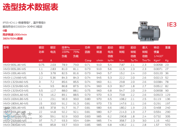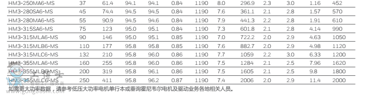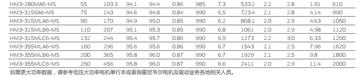 功率: 0.55~1250kW (2P, 4P, 6P),315kW以上信息 請參考低壓大功率電機單行本,其它極數可以按需求定制
