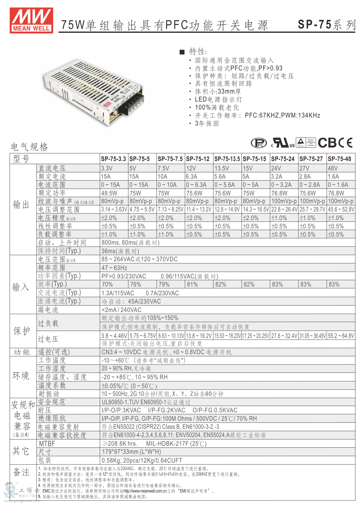 MW臺灣明緯開關(guān)電源SP-75-5 有PFC功能75W 5V 15A
