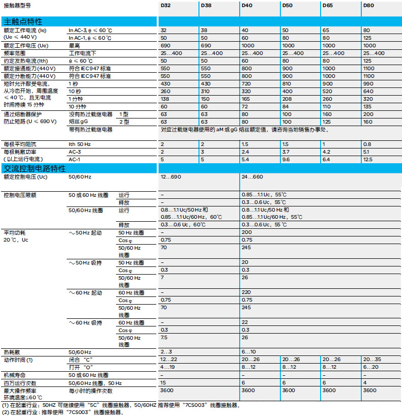 強適應性:“TH”防護處理,可以在濕熱的環境中使用。寬電壓:線圈控制電壓在70%-120%Uc之間波動,不影響產品正常工作。強通用性:具有50Hz-60Hz通用線圈。模塊化:產品本體上可以附加輔助觸頭,通電/斷電延時觸頭,機械閉鎖等模塊。也可以很方便地組合成可逆接觸器、星-三角起動器。國產TeSysD系列:09-95A自帶1NO+1NC輔助觸點,其余型號輔助觸點需另配進口TeSysD系列:09-15A自帶1NO+1NC輔助觸點,其余型號輔助觸點需另配