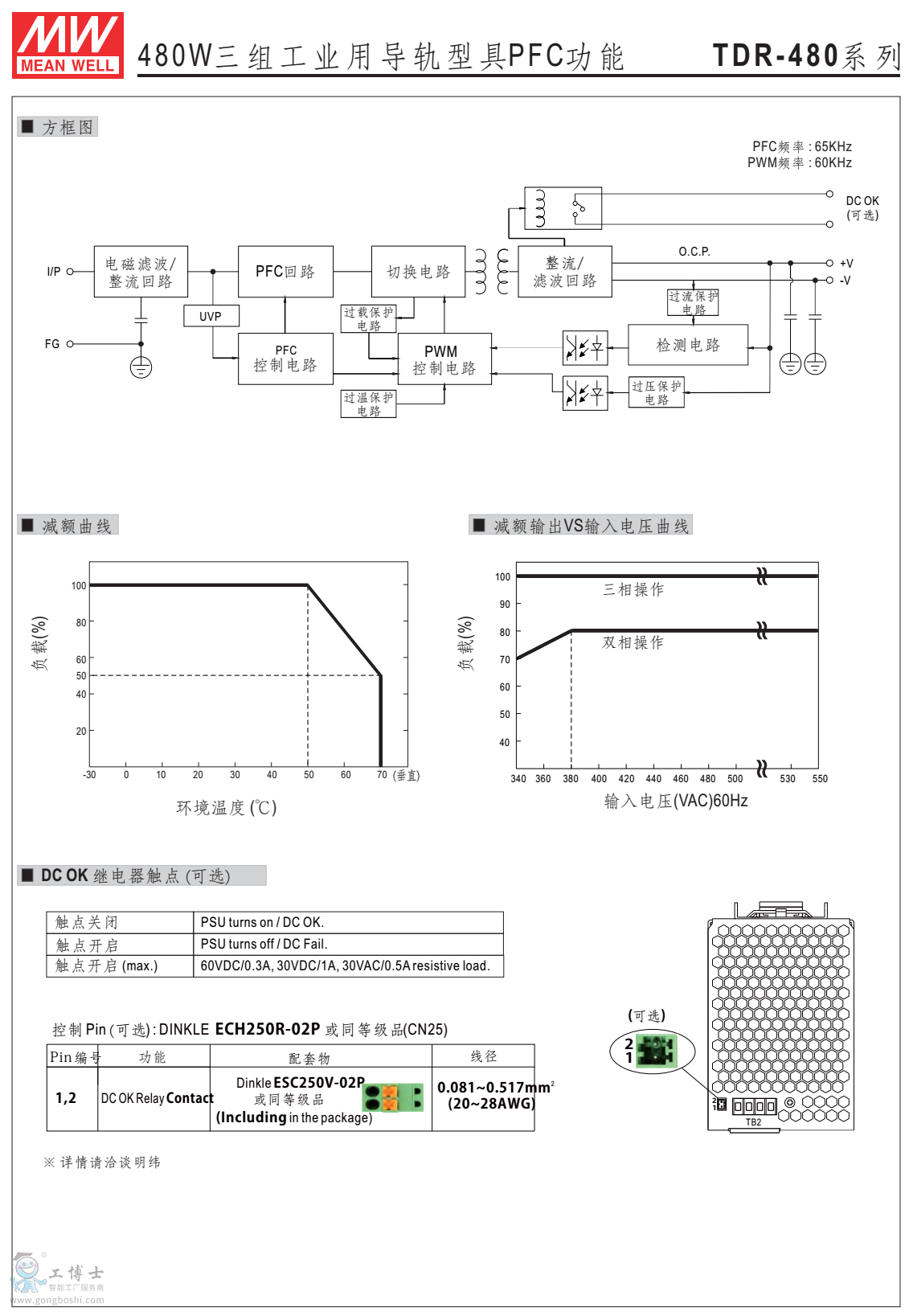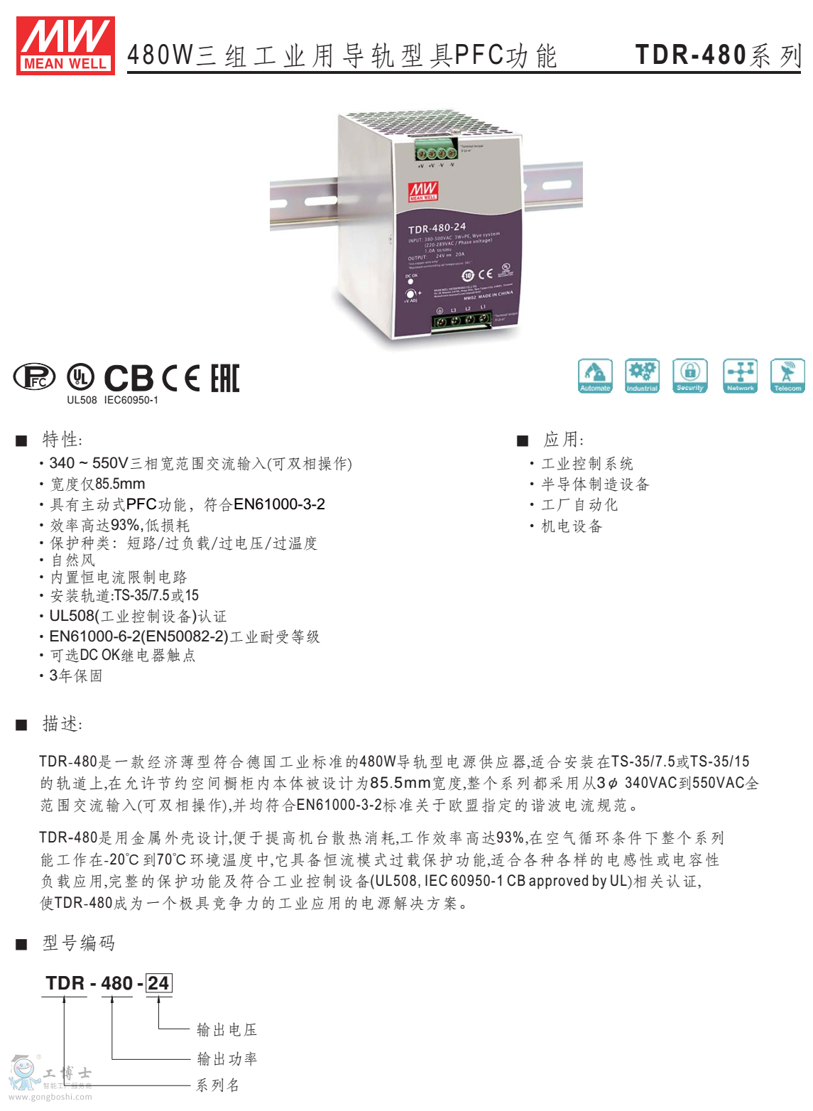 供應型號:TDR-480-24 輸出24V20A 輸入340~550V