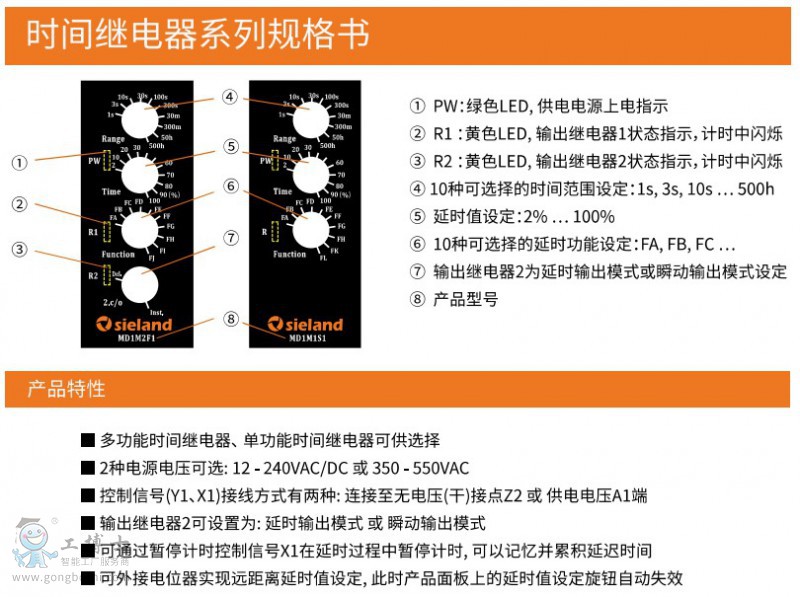上海訊瑯電氣有限公司的時間繼電器系列高端產品采用低功耗、***的32位ARM處理器作為主控芯片, 性能達到甚至超過國際一線品牌如: 西門子、施耐德、ABB, 后發優勢明顯, 助力您的產品國際化、上檔次! 目前已開發完成的100多個型號涵蓋16種常用的延時功能, 時間設定范圍為 0.02秒 ~ 500小時, 額定電壓有兩種可供選擇, 分別是 12 ~ 240 V AC/DC 和 350 ~ 550 V AC