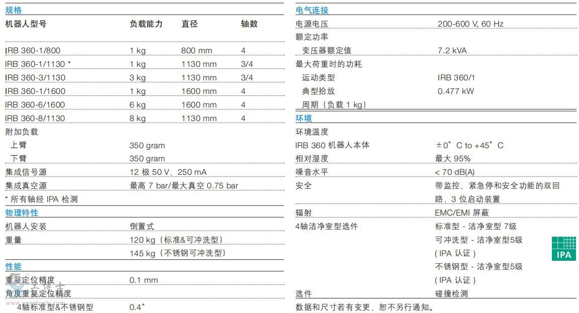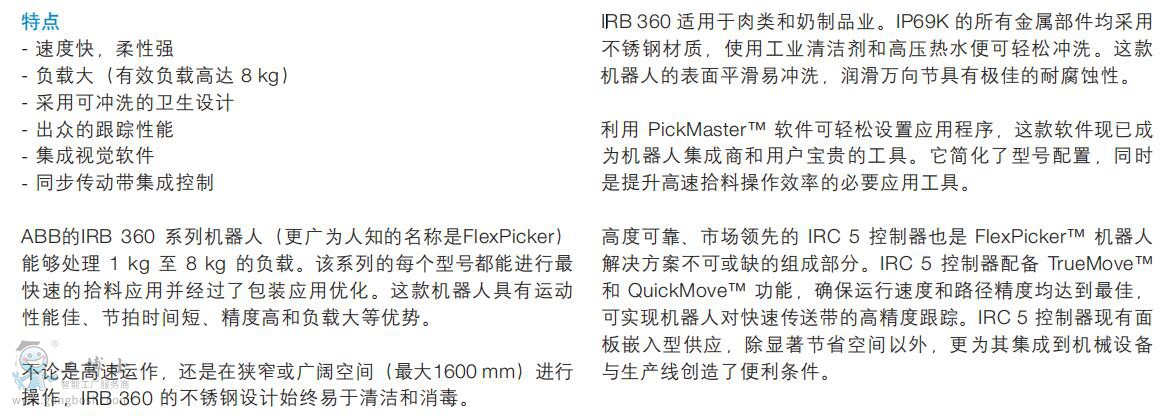 IRB 360系列現(xiàn)包括負載為1kg、3kg、6kg和8kg以及橫向活動范圍為800mm、1130mm和1600mm等幾個型號,這意味著IRB 360幾乎可滿足任何需求。IRB 360具有運動性能佳、節(jié)拍時間短、精度高等優(yōu)勢,能夠在狹窄或者廣闊空間內(nèi)高速運行,誤差極小。每款FlexPicker的法蘭工具經(jīng)過重新設計,能夠安裝更大夾具,從而高速高效地處理同步傳動帶上的流水線包裝產(chǎn)品。