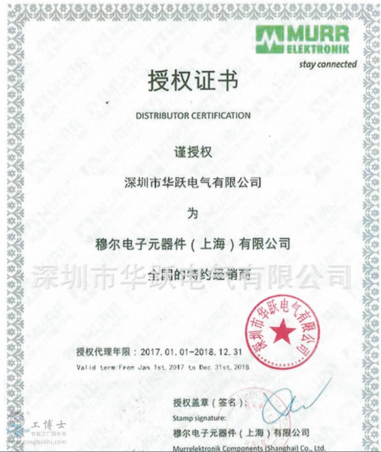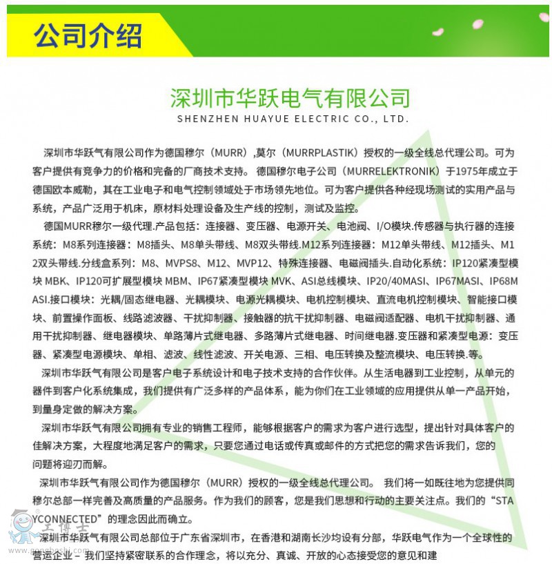 深圳市華躍氣有限公司作為德國穆爾(MURR)授權的一級全線總代理公司。可為客戶提供有競爭力的價格和完備的廠商技術支持。 德國穆爾電子公司(MURRElektronik)于1975年成立于德國歐本威勒,其在工業電子和電氣控制領域處于市場**地位。可為客戶提供各種經現場測試的實用產品與系統,產品廣泛用于機床,原材料處理設備及生產線的控制,測試及監控。