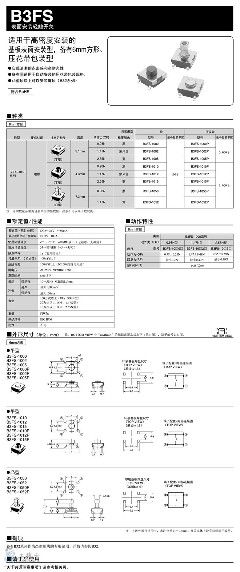 B3FS-1000P 輕觸式開關 歐姆龍/OMRON原裝** 千洲