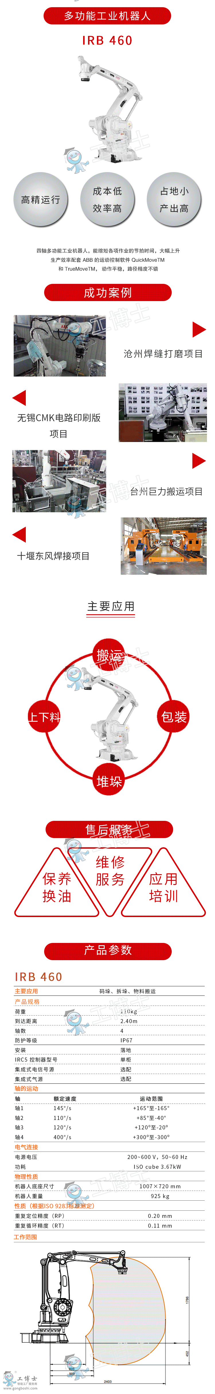 IRB 460機器人是由ABB提供的新型緊湊碼垛機器人,機器人本體重量為110公斤,機器人是全球*快的碼垛機器人,是高速碼袋、碼箱作業的**之選。