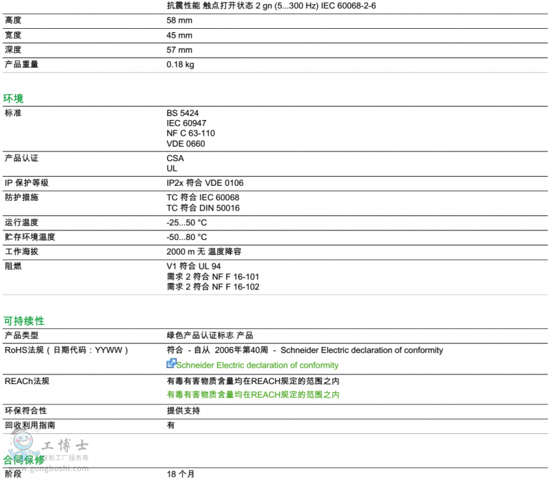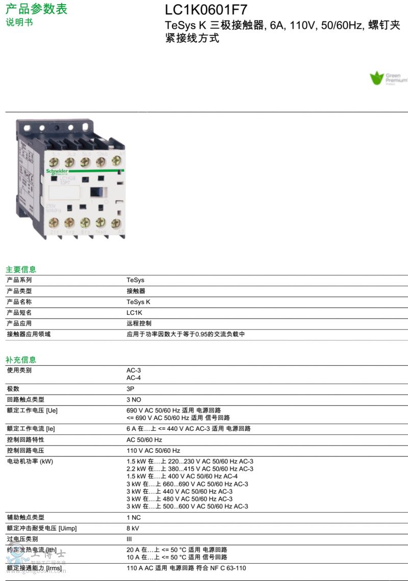 施耐德/Schneider 三極接觸器 LC1K0601F7 6A 110V 50/60HZ