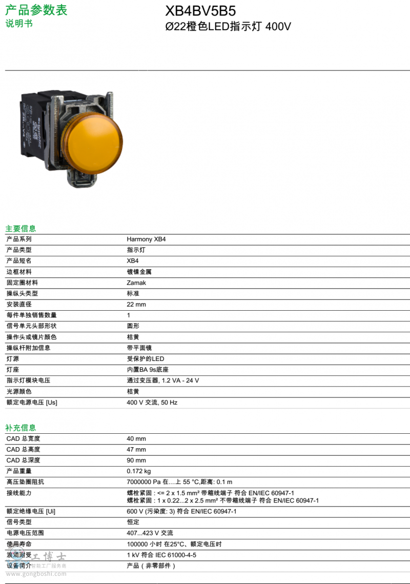 XB4BV5B5 指示燈 施耐德/Schneider Ø22 橙色LED 400V