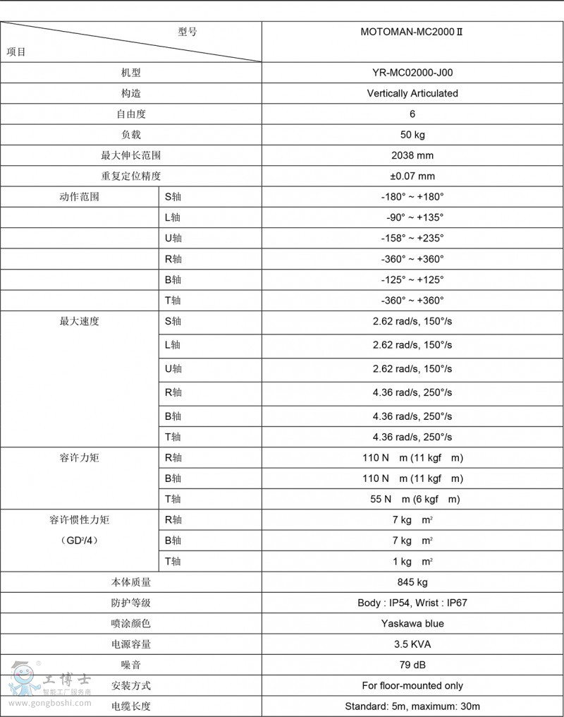 安川工業機器人:MOTOMAN-MC2000Ⅱ主要參數: