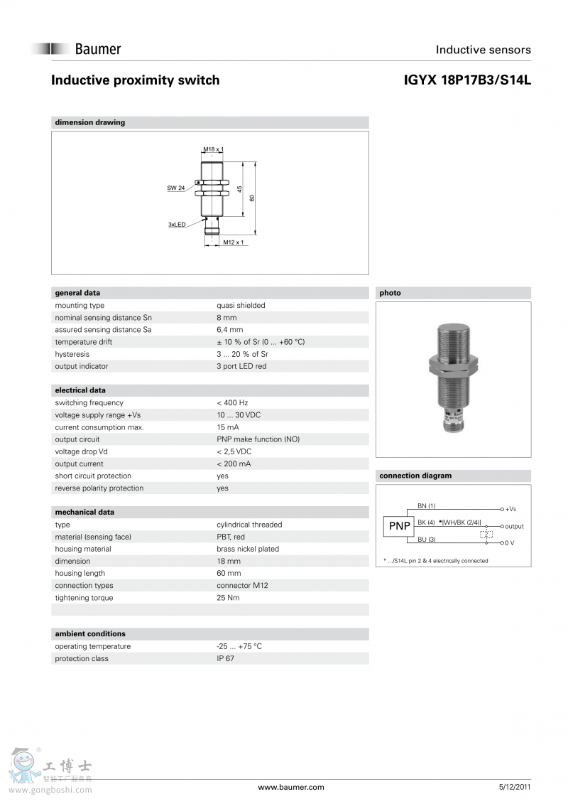 Baumer堡盟電感式接近開關IGYX 18P17B3S14L開增值票