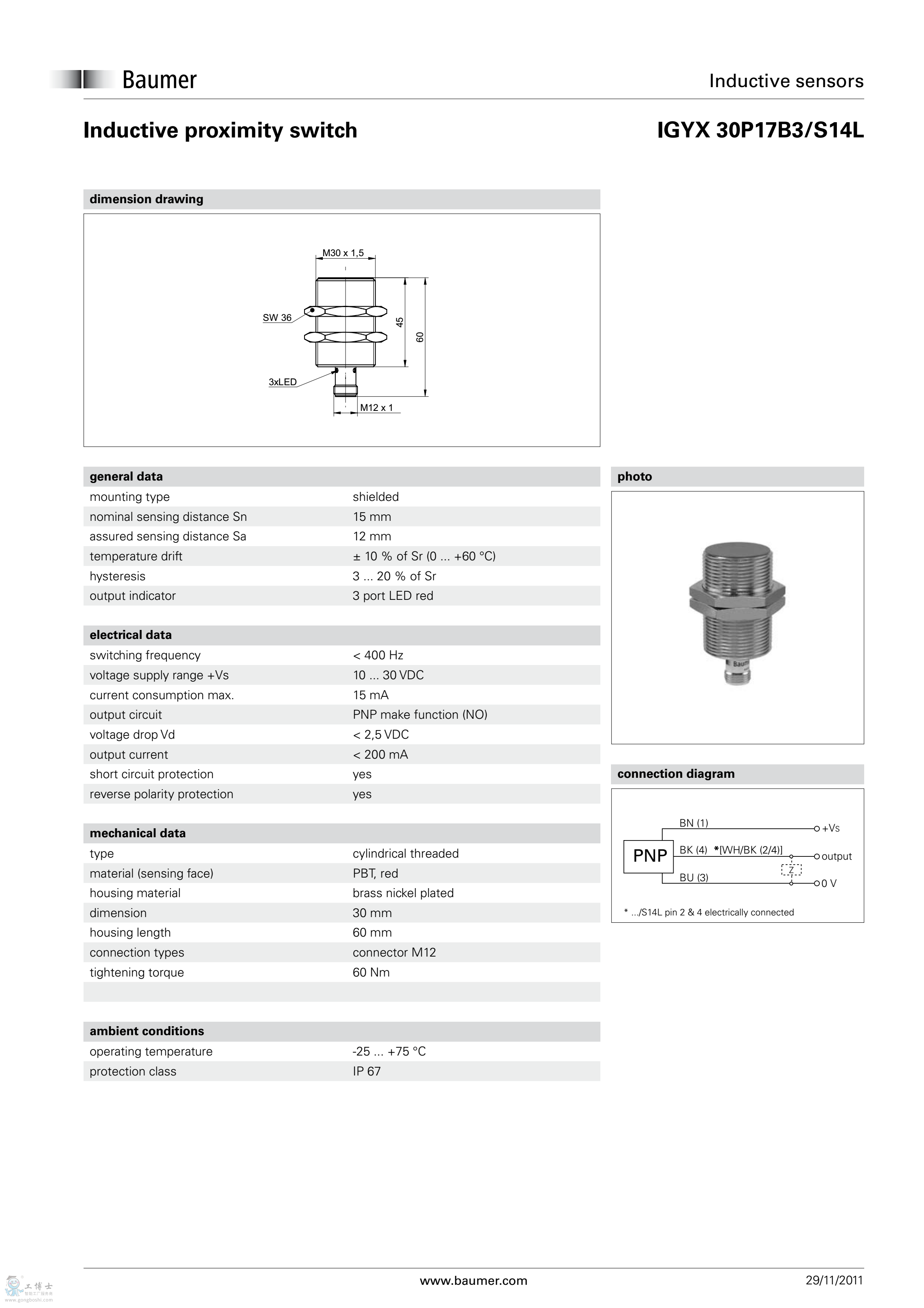 Baumer堡盟電感式接近開關(guān)IGYX 30P17B3/S14L開增值票現(xiàn)貨