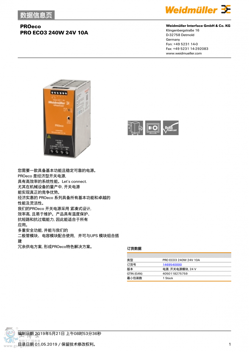 魏德米勒weidmulle電源PRO ECO3 240W 24V 10A三相1469550000