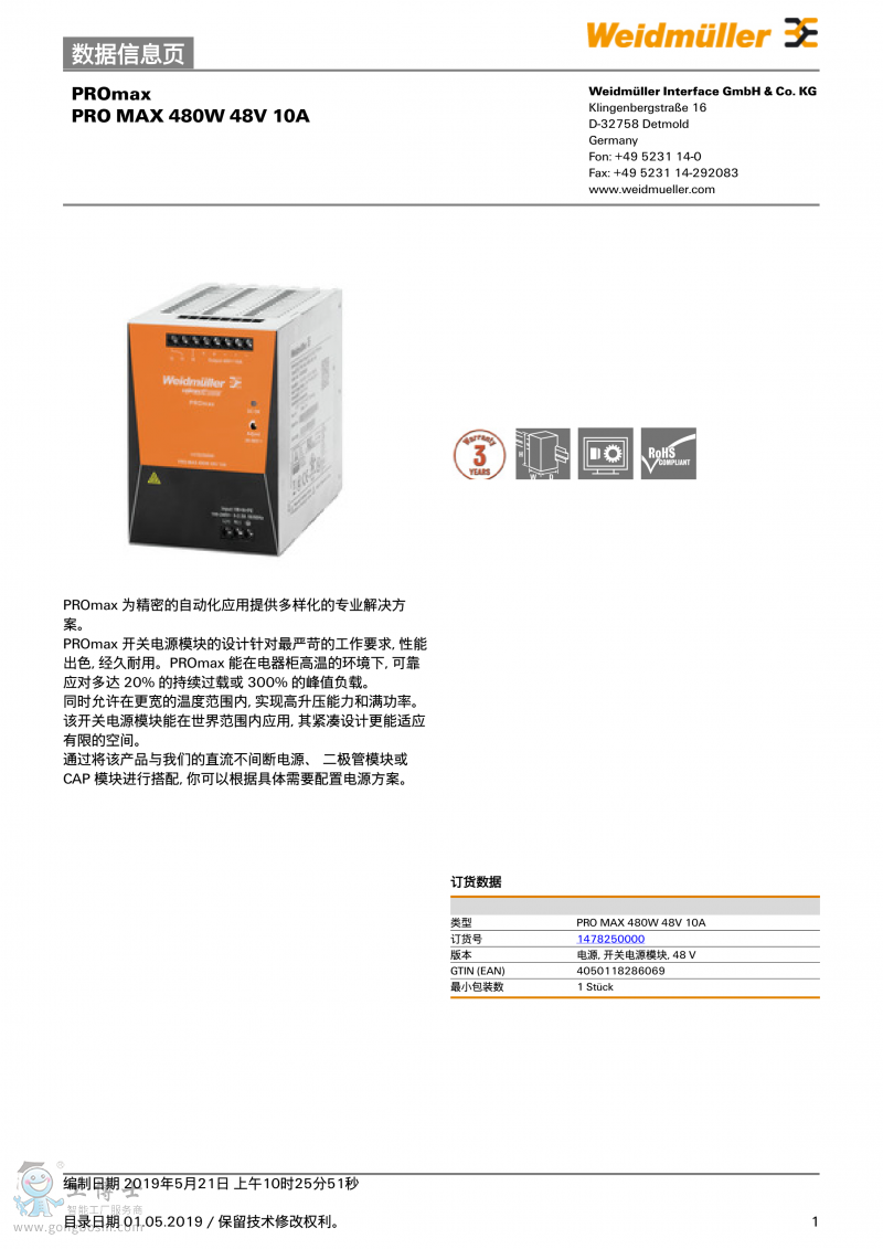 魏德米勒weidmulle開關(guān)電源PRO MAX 480W 48V 10A單相1478250000