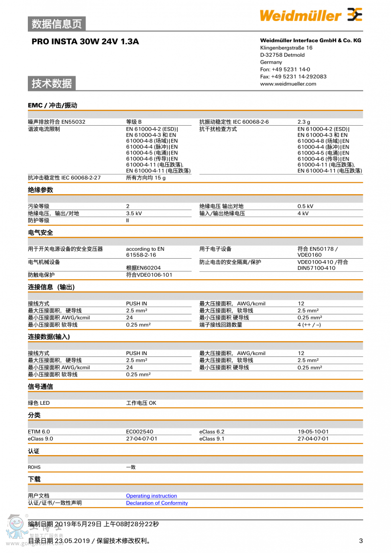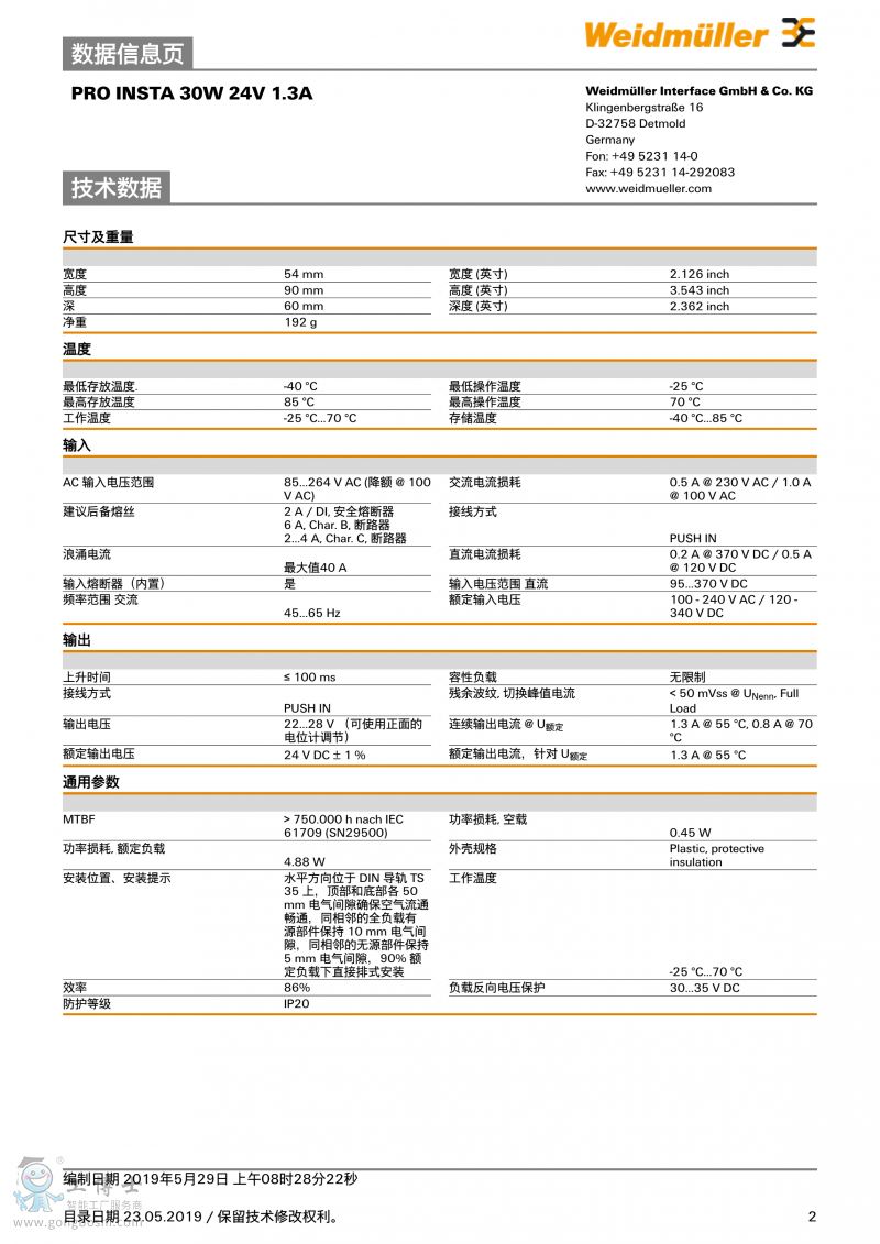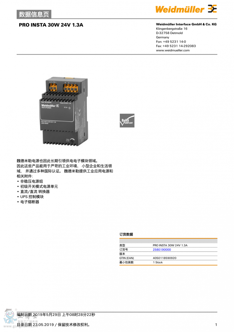 魏德米勒weidmulle電源PRO INSTA 30W 24V 1.3A訂貨號2580190000