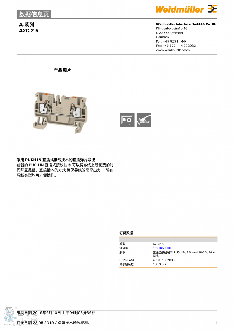 魏德米勒weidmulle直通型接線端子A2C 2.5訂貨號1521850000