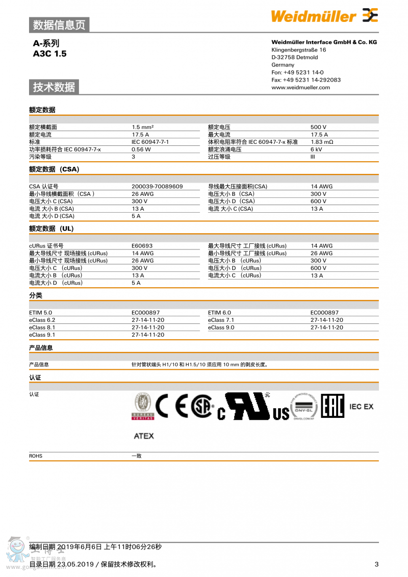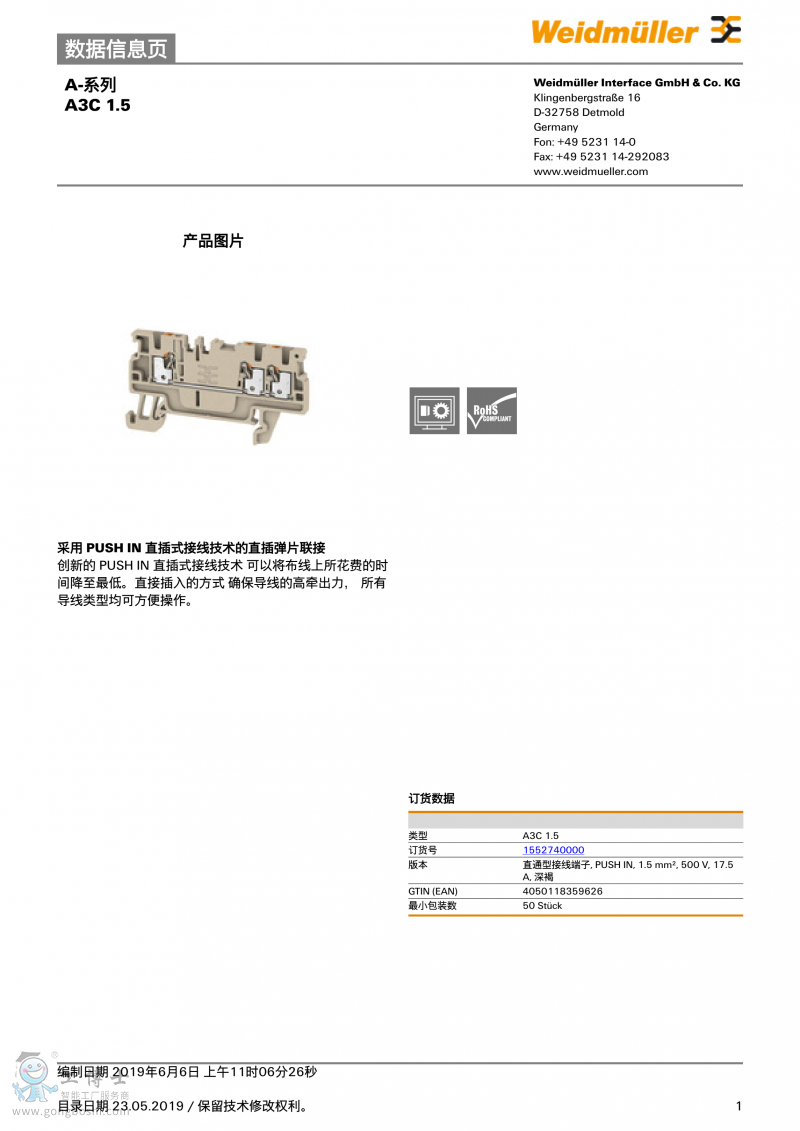 魏德米勒weidmulle直通型接線端子A3C 1.5訂貨號1552740000