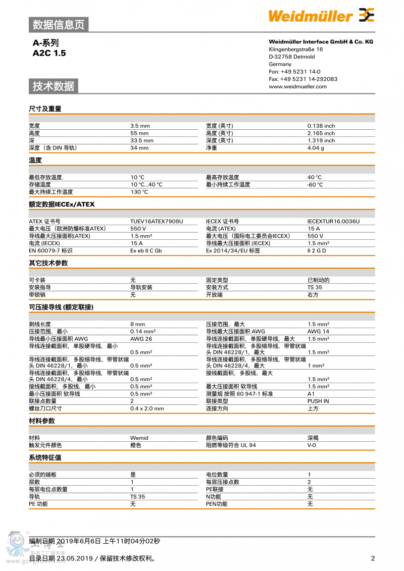 魏德米勒weidmulle直通型接線端子A2C 1.5訂貨號1552790000