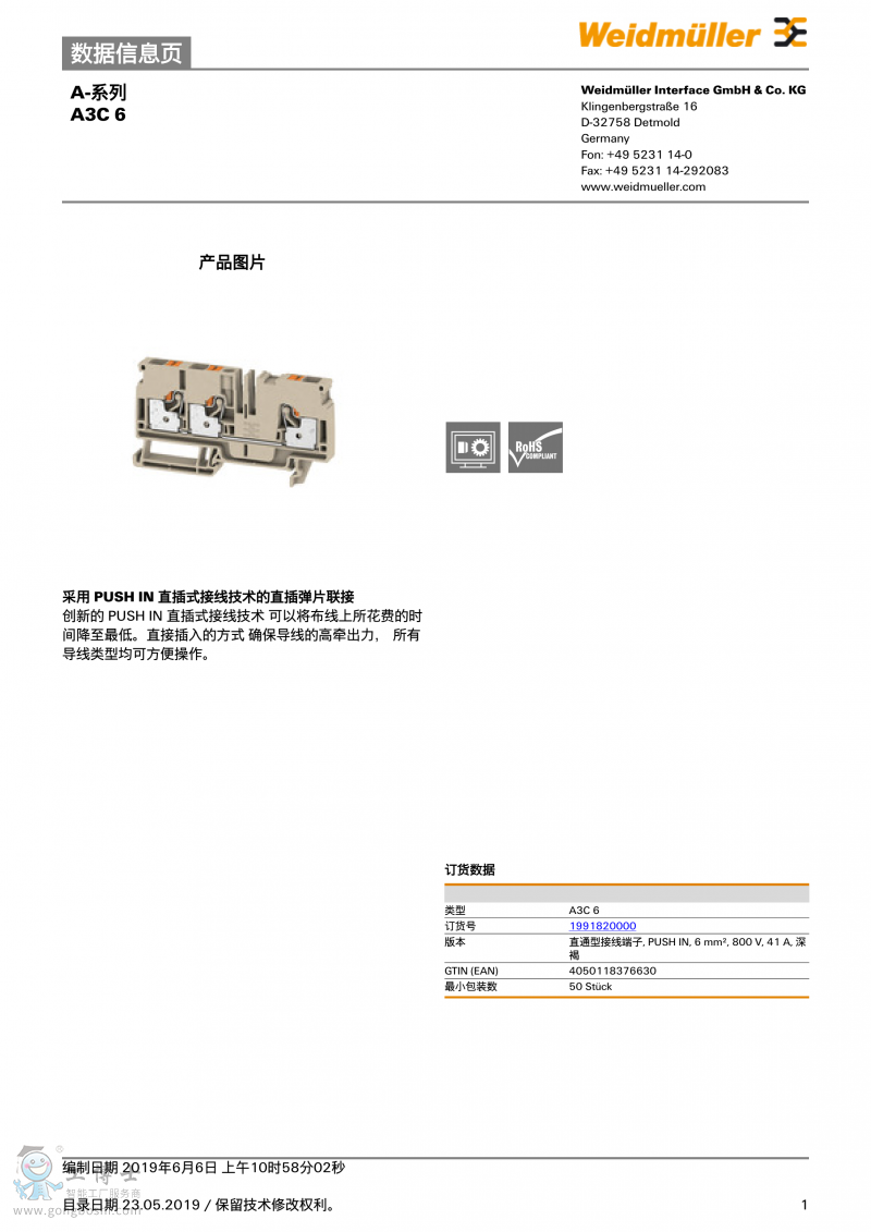 魏德米勒weidmulle直通型接線端子A3C 6訂貨號(hào)1991820000