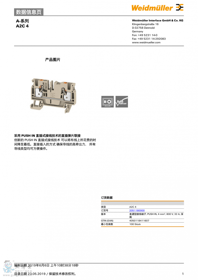 魏德米勒weidmulle直通型接線端子A2C 4訂貨號2051180000