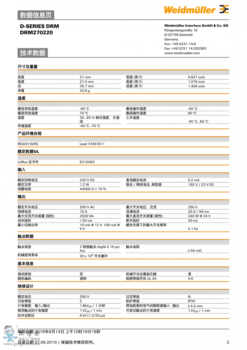 DRM270220魏德米勒weidmulle標準繼電器訂貨號7760056054
