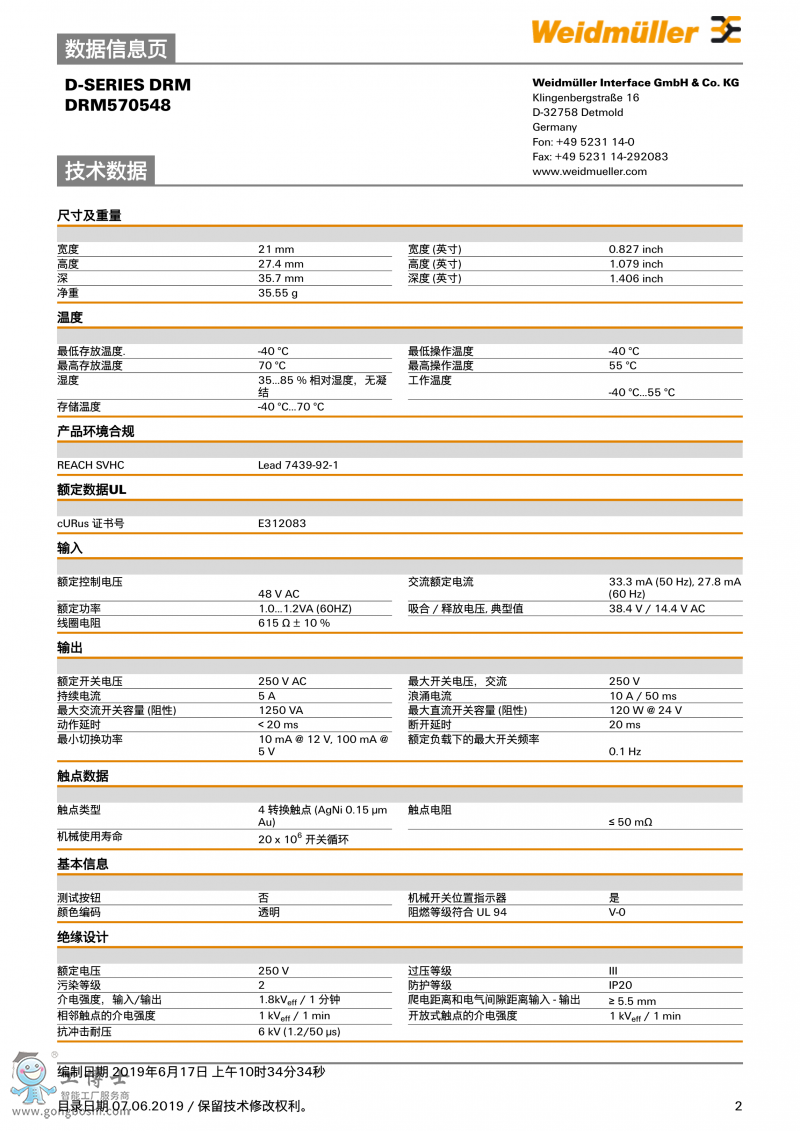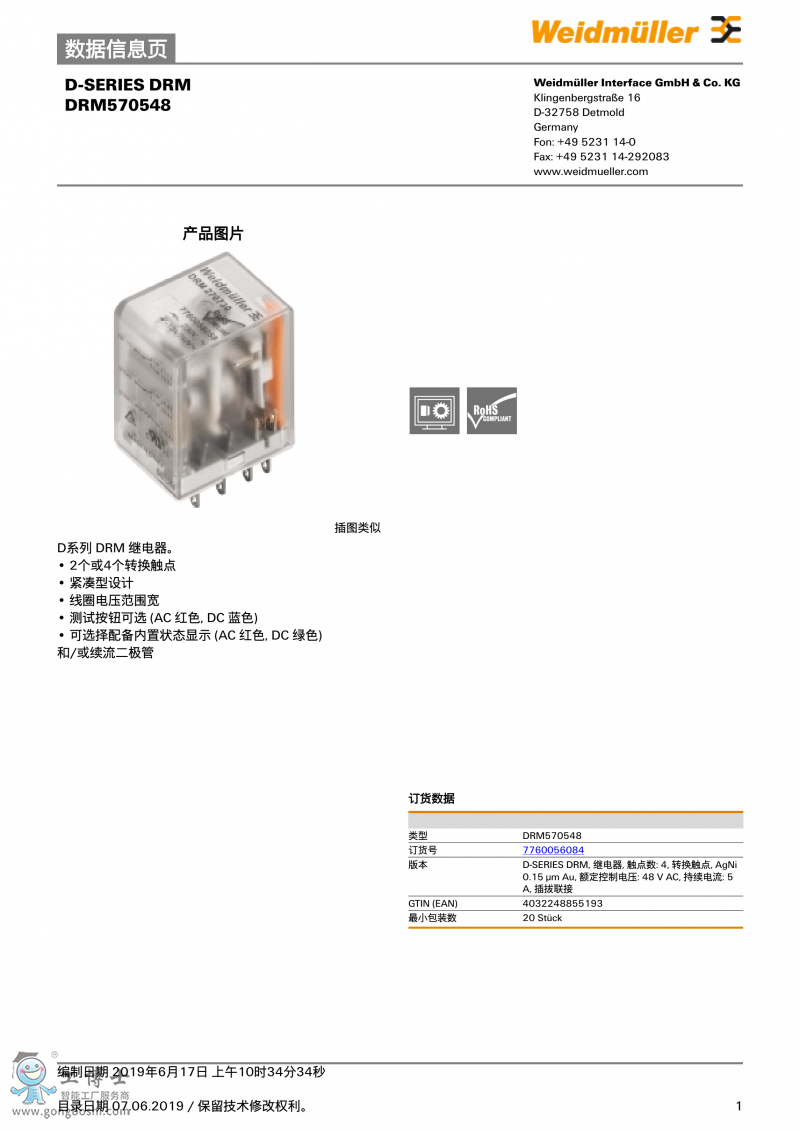 DRM570548魏德米勒weidmulle標準繼電器訂貨號7760056084