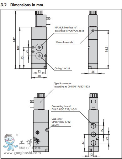 The air connections are designed as thread-ed holes with G '/s thread or NAMUR inter-face according to VDI/VDE 3845, depend-ing on the device version.