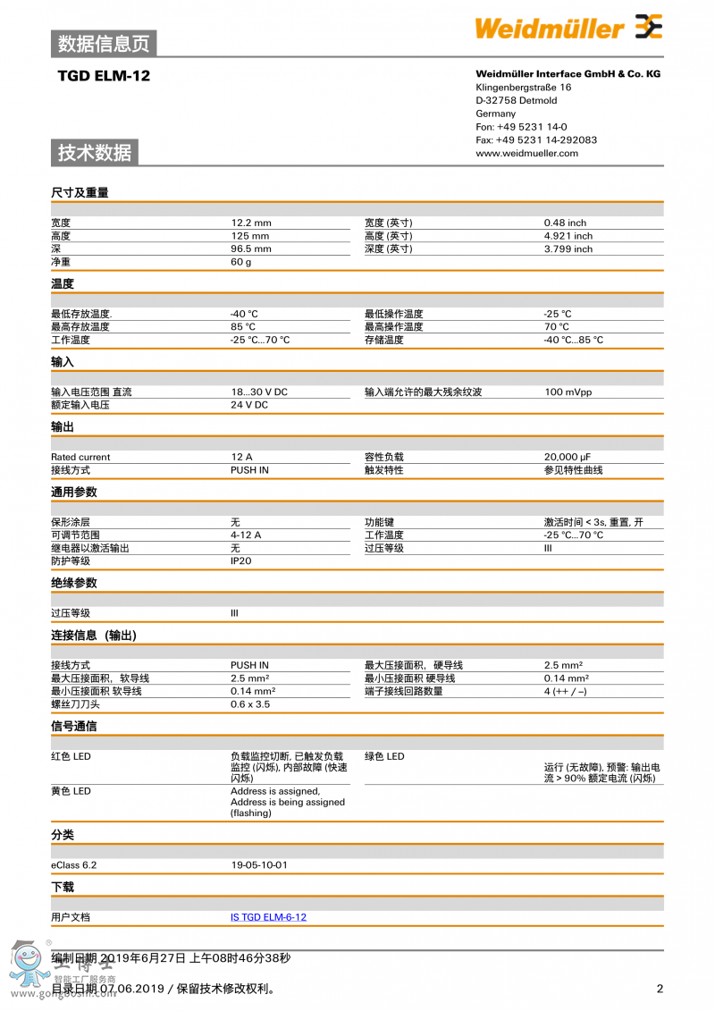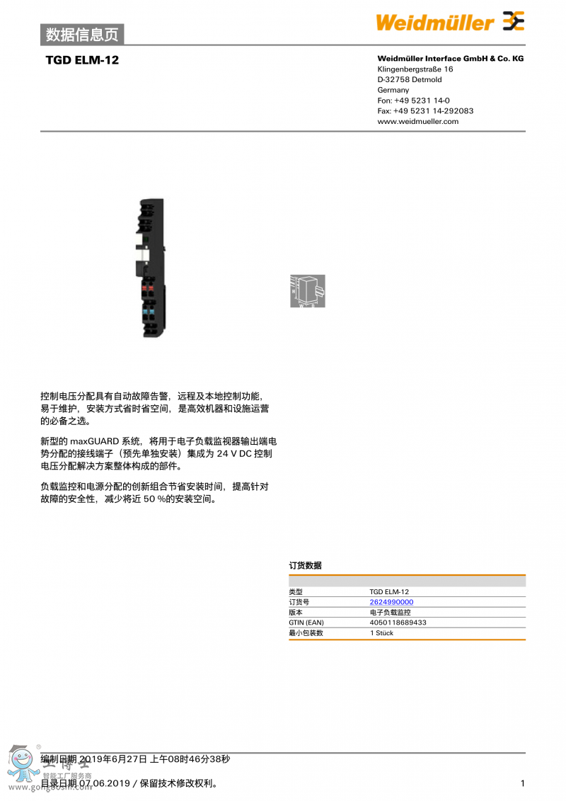 TGD ELM-12魏德米勒weidmuller maxGUARD分配器訂貨號2624990000
