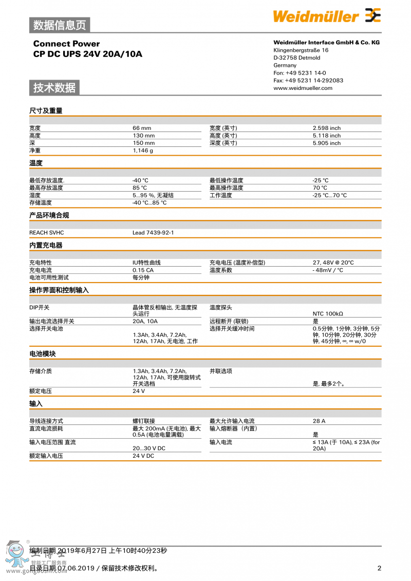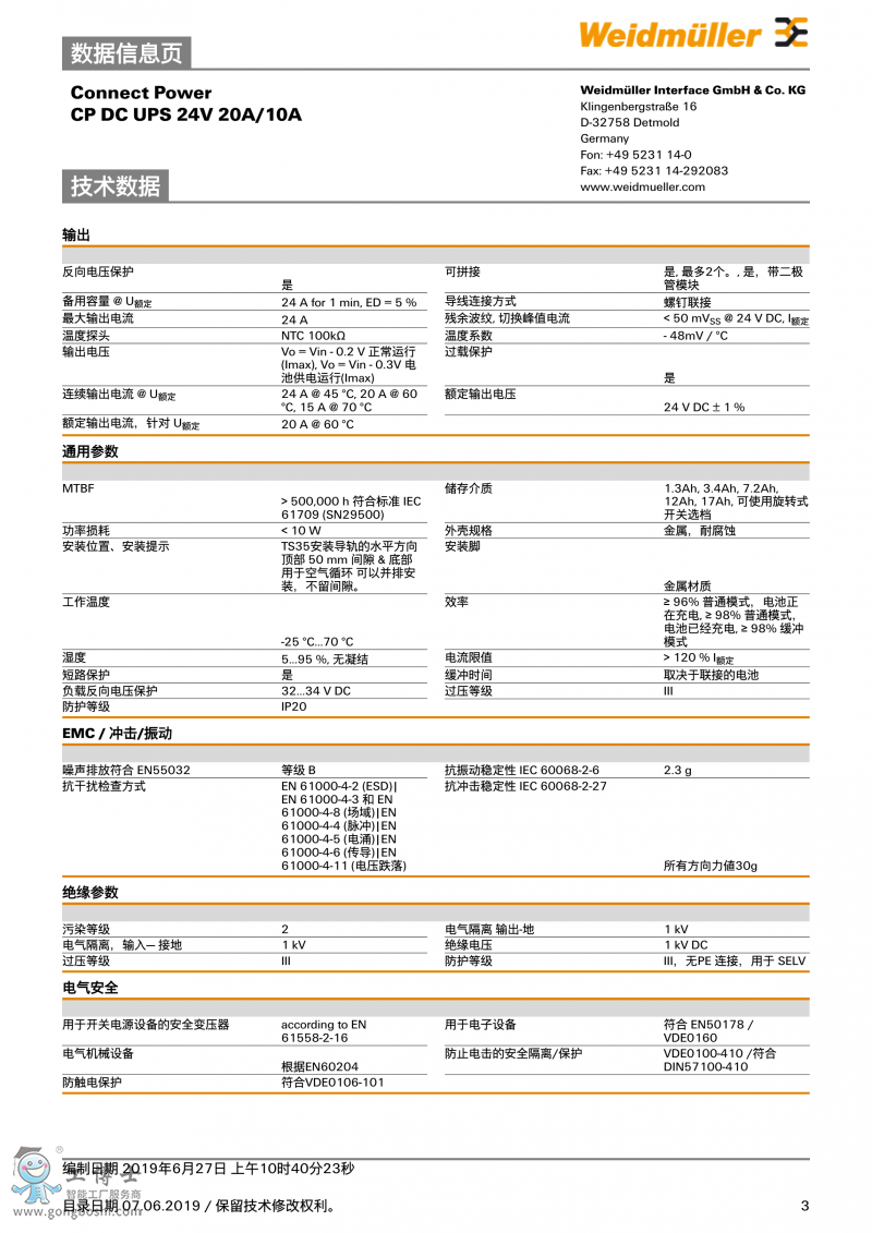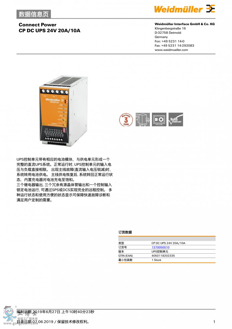 CP DC UPS 24V 20A魏德米勒weidmuller UPS控制單元1370050010