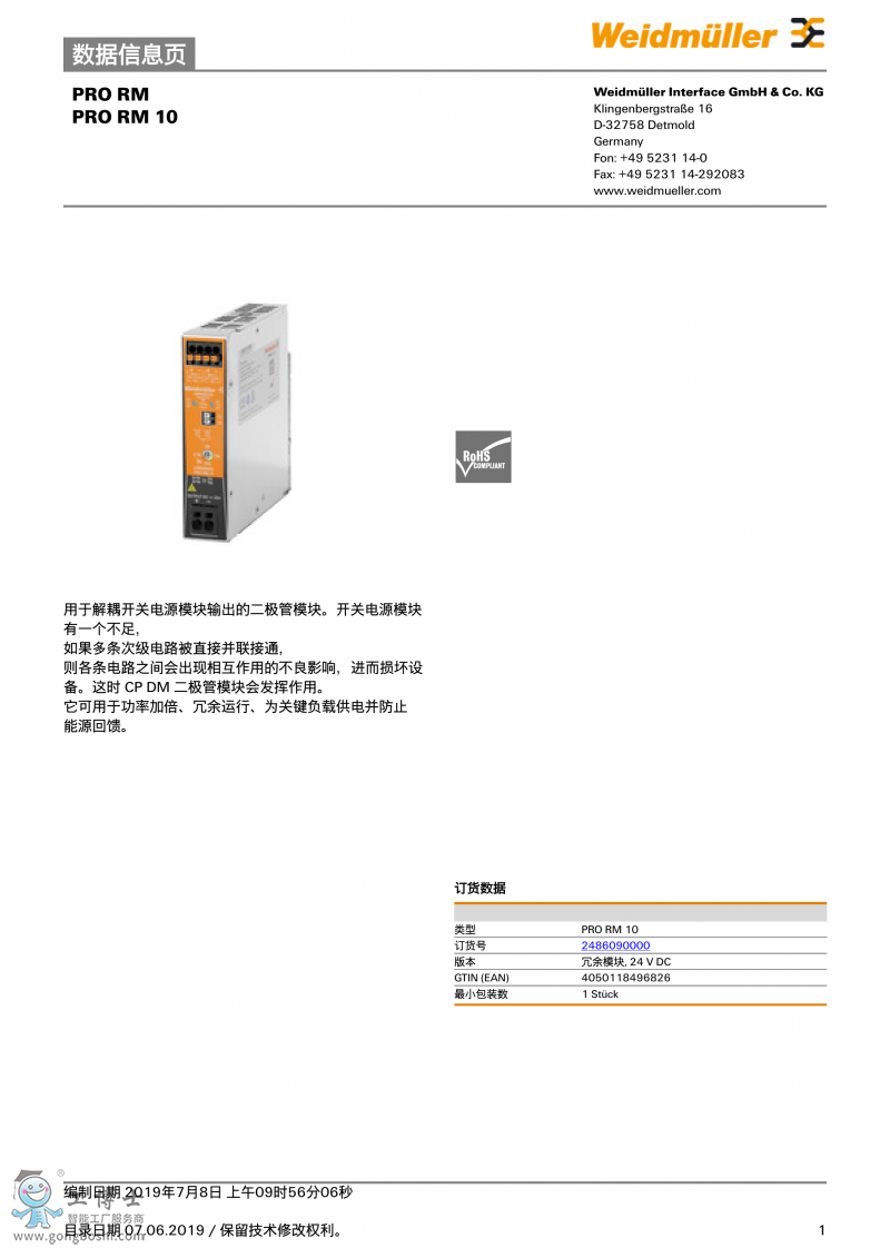 PRO RM 10魏德米勒weidmuller 冗余模塊 訂貨號2486090000