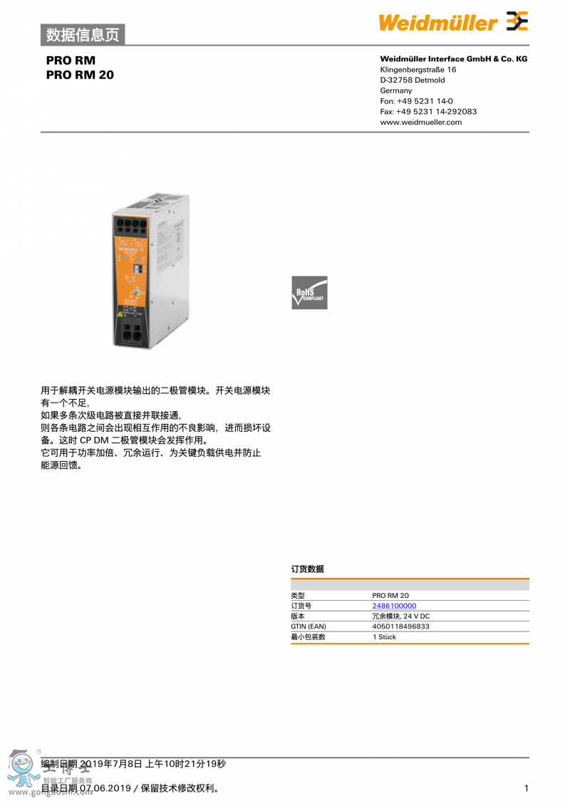 PRO RM 20魏德米勒weidmuller 冗余模塊 訂貨號2486100000