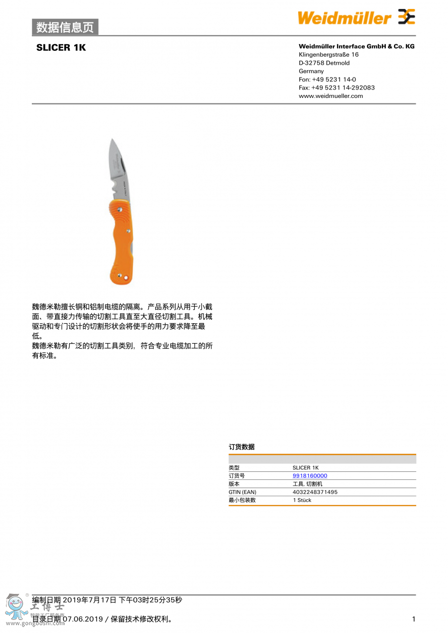 SLICER 1K 魏德米勒weidmuller 切割機 訂貨號9918160000