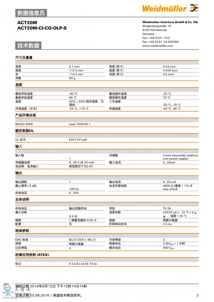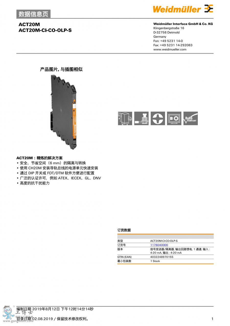 ACT20M-CI-CO-OLP-S魏德米勒weidmulle 變送器 訂貨號(hào)1176040000