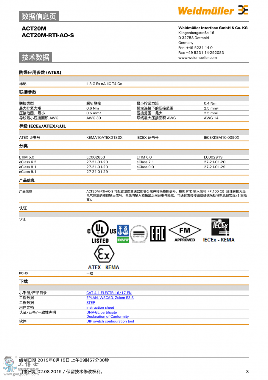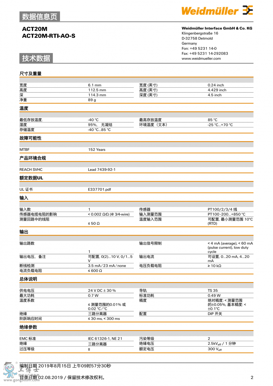 ACT20M-RTI-AO-S魏德米勒weidmuller信號分配器 訂貨號1375510000