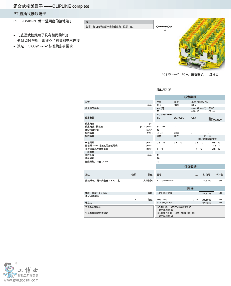 菲尼克斯phoenix直插式接線 PT 10-TWIN-PE訂貨號3208745原裝現貨 可開增票