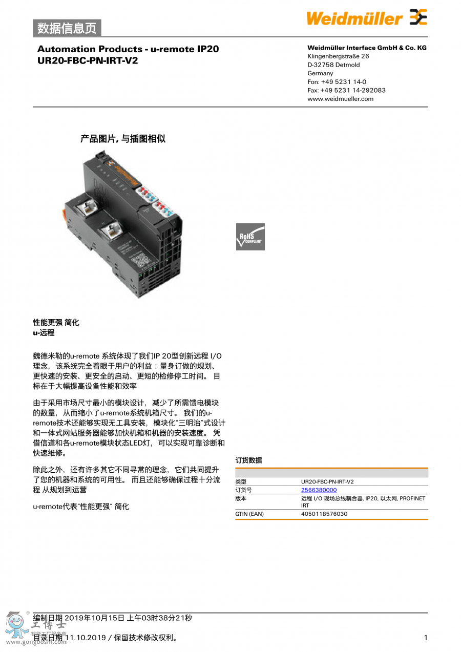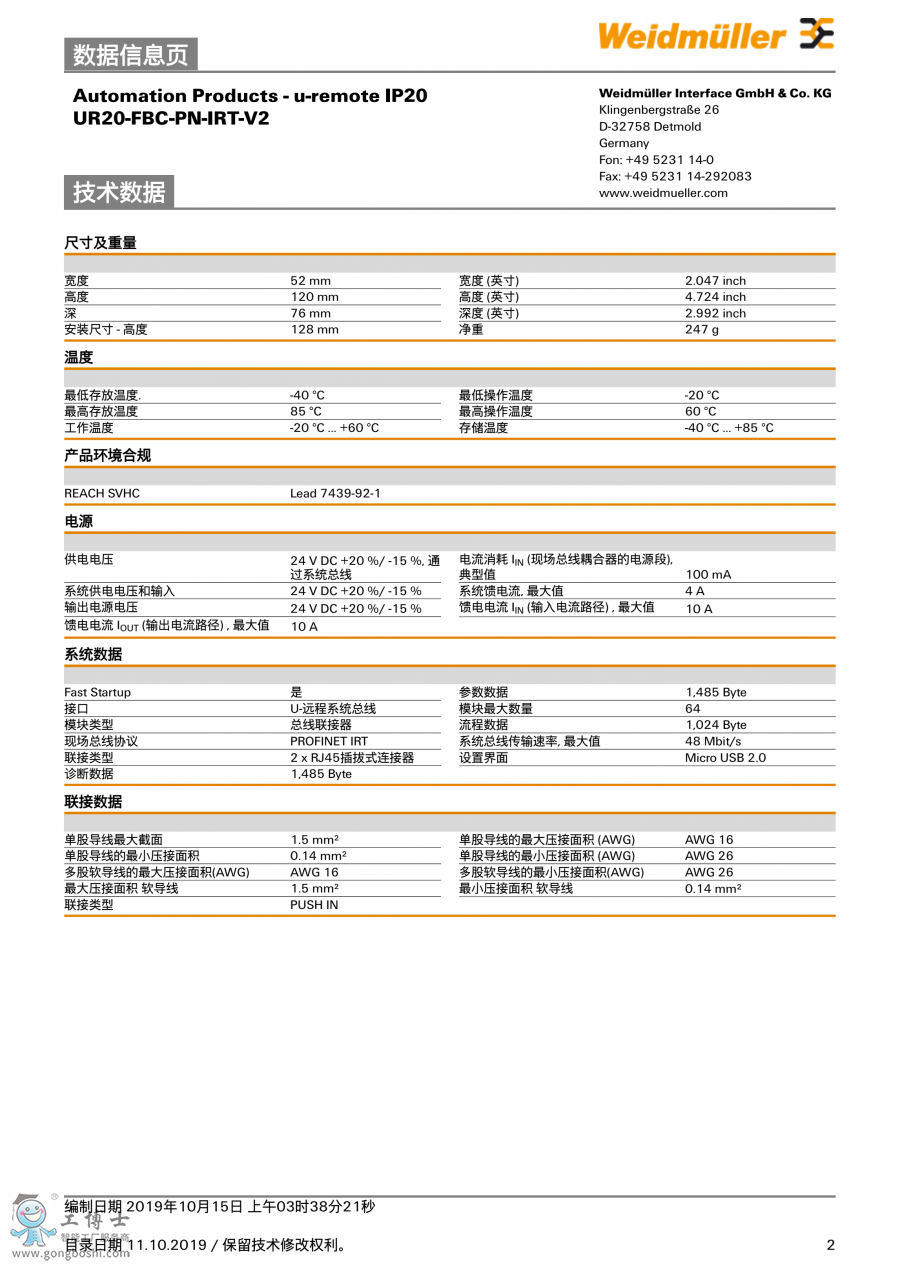 UR20-FBC-PN-IRT-V魏德米勒weidmuller遠(yuǎn)程I/O訂貨號(hào)2566380000