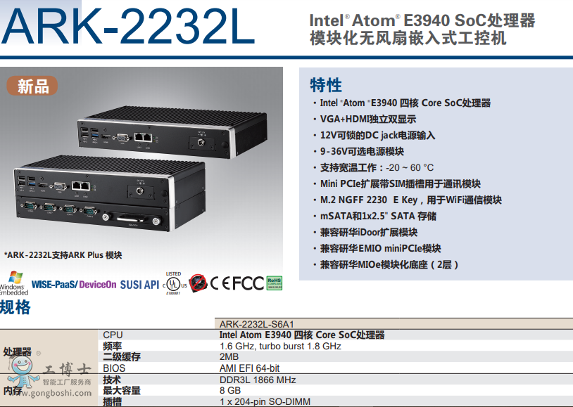 品牌:ADVANTECH/研華   型號:ARK-2232L   類型:無風扇嵌入式工控機