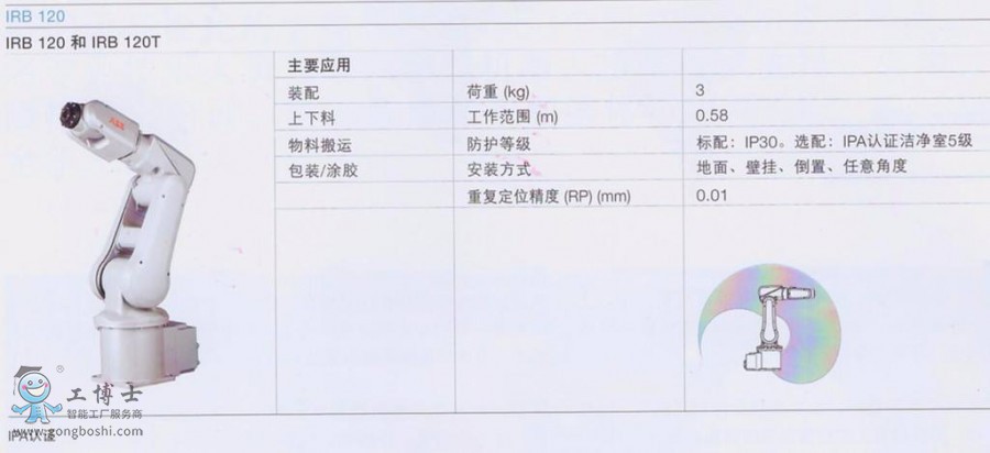 IRB_120 是ABB新型第四代機(jī)器人家族的*新成員,也是迄今為止ABB制造的*小機(jī)器人。IRB_120具有敏捷,緊湊,輕量的特點(diǎn),控制精度與路徑精度俱優(yōu),是物料搬運(yùn)與裝配應(yīng)用的理想選擇。主要應(yīng)用:裝配,上下料,物料搬運(yùn),包裝,涂膠密封。負(fù)載:量3kg,工作區(qū)域是580mm。