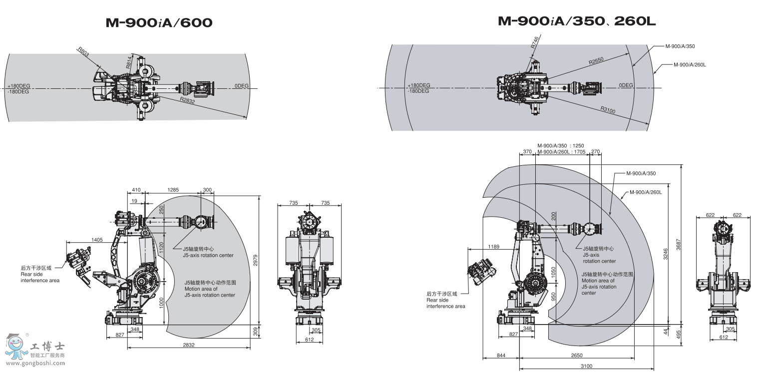 —FANUC Robot M一900iA/350這是一款可搬運(yùn)重量為350kg的機(jī)器人。它不需要J2/J3軸的平衡調(diào)節(jié)機(jī)構(gòu),大大擴(kuò)展了前后和上下方向的動作范圍。在標(biāo)準(zhǔn)配置下,可以進(jìn)行地設(shè)置和倒掛設(shè)置。