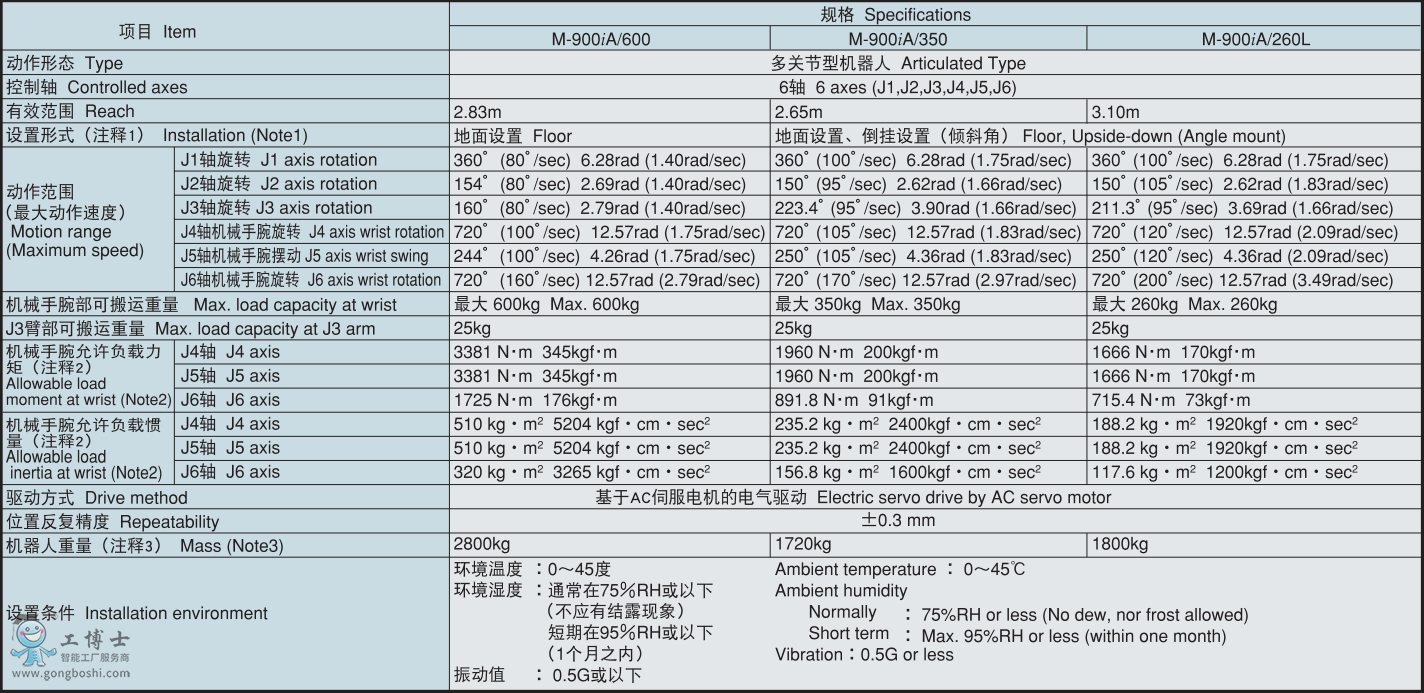 FANUC Robot M一900iA是一款可搬運(yùn)重物的機(jī)器人,其可搬運(yùn)重達(dá)260kg、600kg的物體。