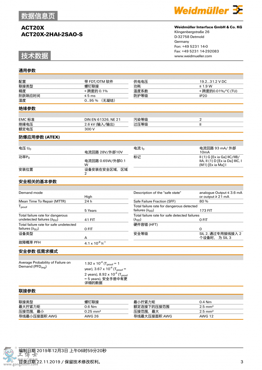 ACT20X-2HAI-2SAO-S 魏德米勒 防爆信號隔離轉換器 訂貨號8965440000