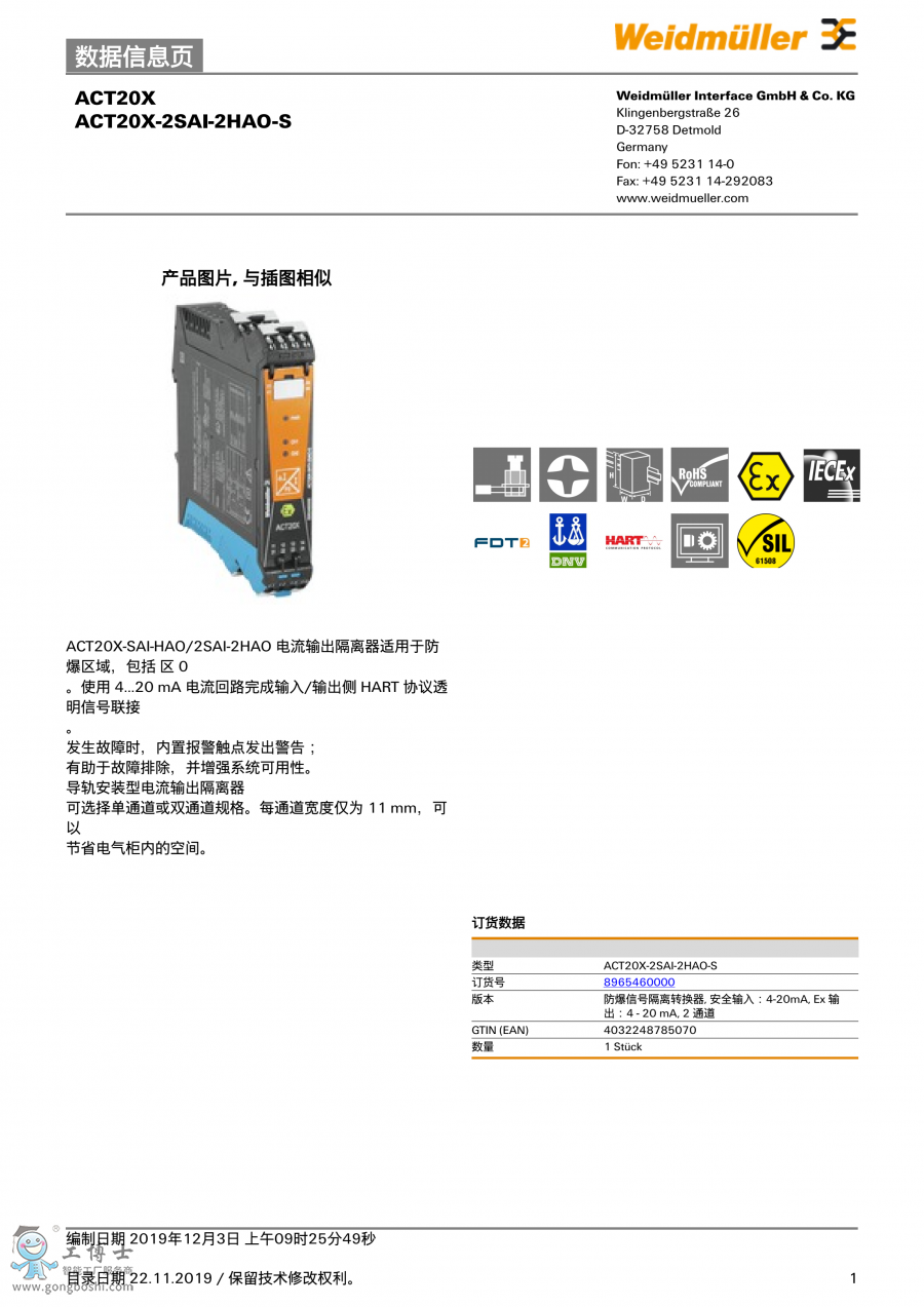 ACT20X-2SAI-2HAO-S 魏德米勒 防爆信號(hào)隔離轉(zhuǎn)換器 訂貨號(hào)8965460000