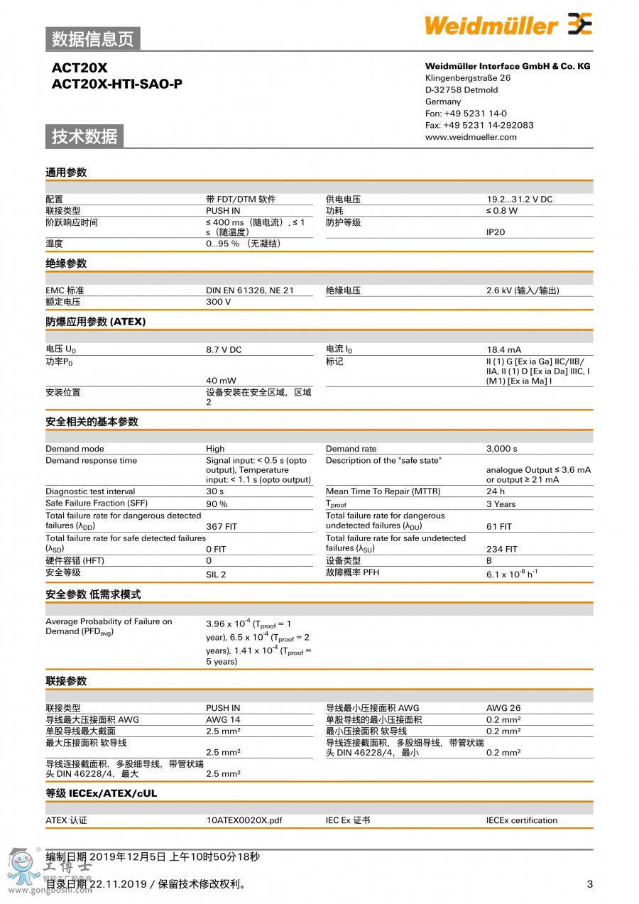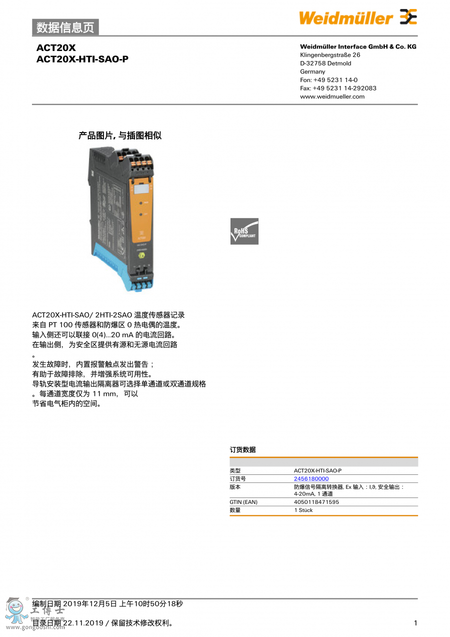 ACT20X-HTI-SAO-P 魏德米勒 防爆信號隔離轉換器 訂貨號2456180000