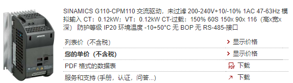 產品說明 SINAMICS G110-CPM110 交流驅動,未過濾 200-240V+10/-10% 1AC 47-63Hz 模擬輸入 CT:0.12kW;VT:0.12kW CT-過載:150% 60S 150x 90x 116(高x寬x深) 防護等級 IP20 環境溫度 -10+50°C 無 BOP 無 RS-485-接口