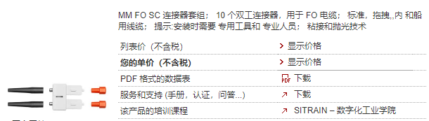 MM FO SC 連接器套組; 10 個雙工連接器,用于 FO 電纜; 標準,拖拽,,內 和船用線纜; 提示:安裝時需要 專用工具和 專業人員; 粘接和拋光技術 |