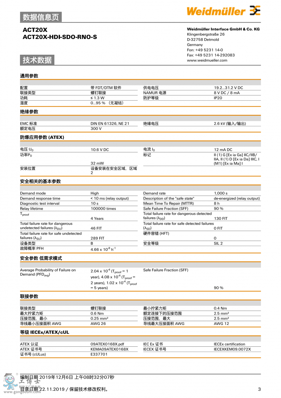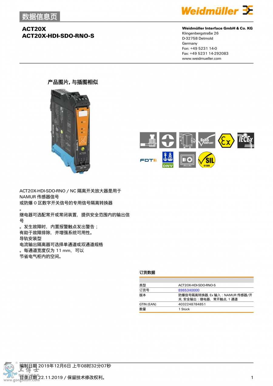 ACT20X-HDI-SDO-RNO-S 魏德米勒 防爆信號隔離轉換器 訂貨號8965340000